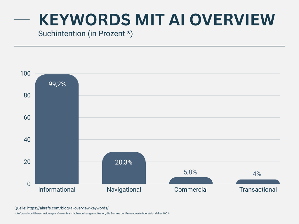 Aber: Nicht alle Keywords sind hiervon gleichermaßen betroffen. Laut einer Studie von Ahrefs steht hinter den Suchanfragen, die Google mit KI beantwortet, zu 99,2% ein informationelles Bedürfnis: